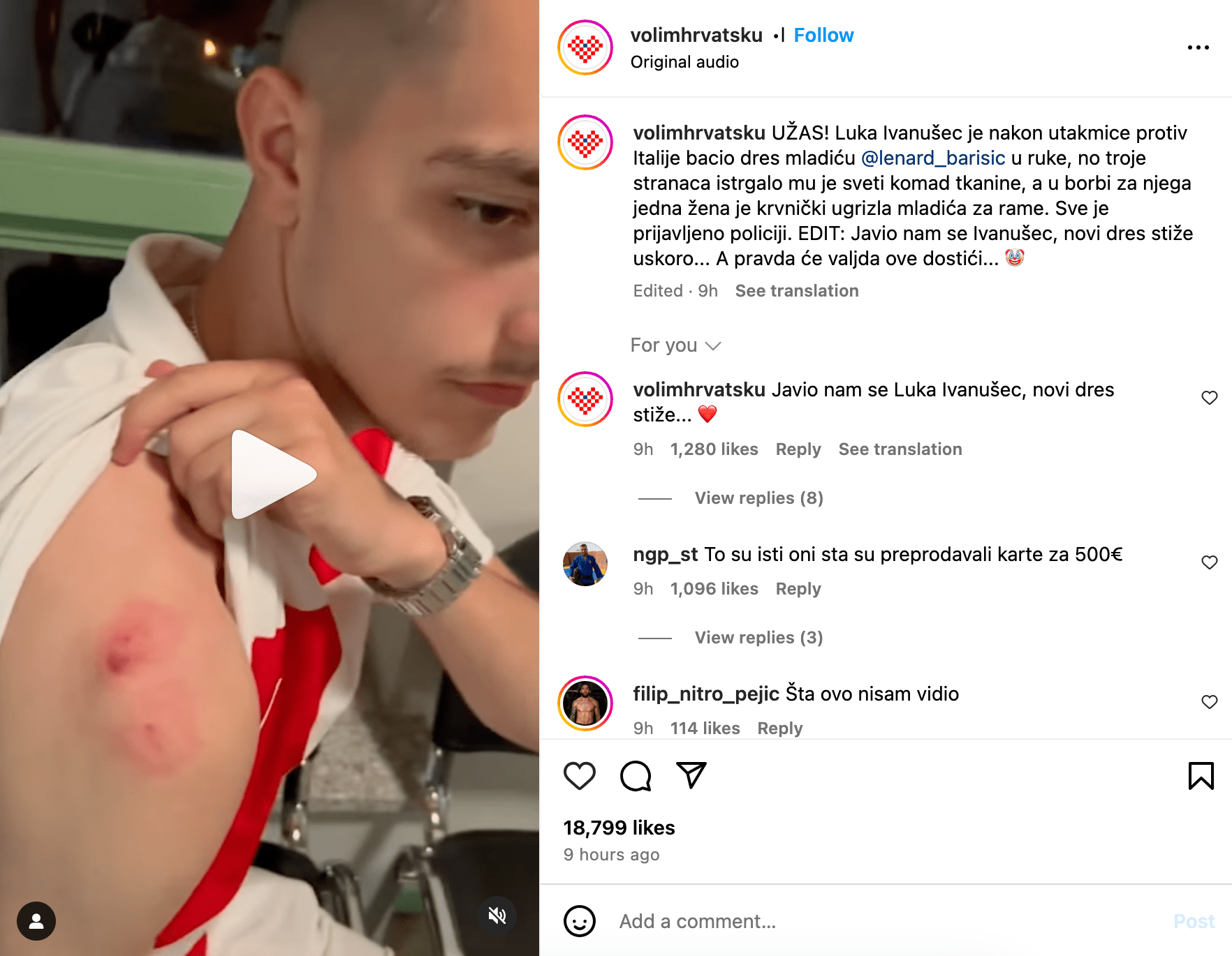 Po meczu Euro 2024 z Włochami (1-1), chorwacki pomocnik Luka Ivanušec rzucił swoją koszulkę kibicowi na trybunach, po czym kilku innych kibiców próbowało mu ją odebrać. Próbując odzyskać koszulkę, jeden z kibiców ugryzł mężczyznę w ramię.